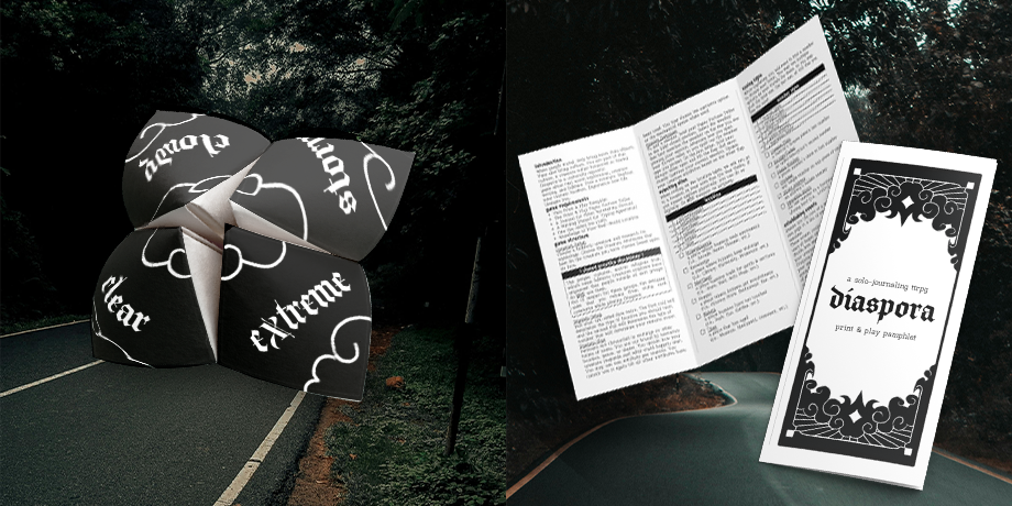 Diaspora is a rules-lite solo-journaling TTRPG where you become a creature of legend that travellers have brought to a new land. As you explore your new location, you change. You may grow, reconnect, or forget altogether. What does it mean when those around you forget your powers? What does it mean when no one remembers your purpose, not even yourself? Do we have to choose between what we are and what others demand us to be?
